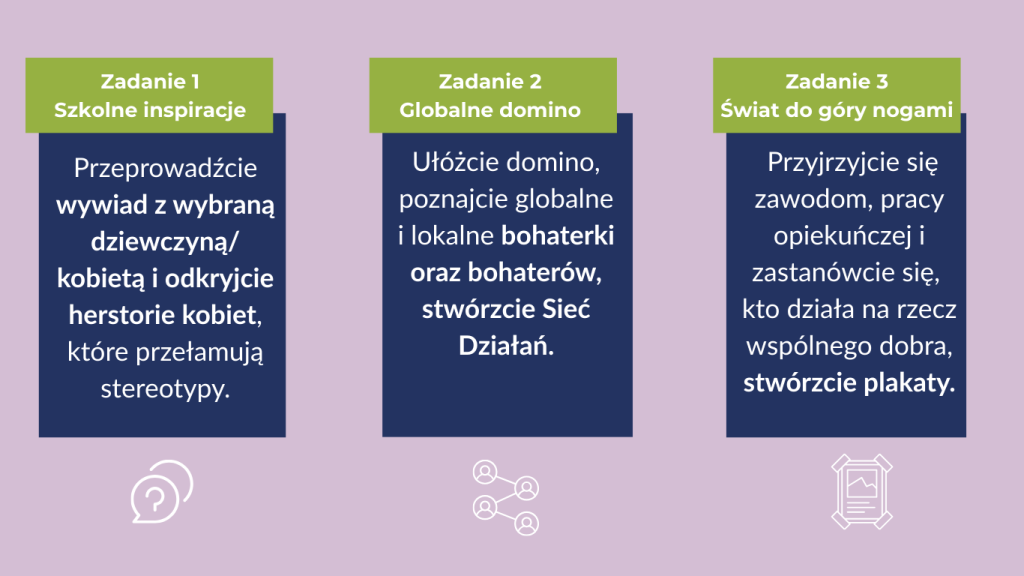 Między 4 a 13 marca 2026 r. zrealizujcie razem z uczniami i uczennicami jedno z przygotowanych zadań (opisane poniżej), które pozwala przyjrzeć się kobietom w Waszej szkole i w lokalnej społeczności, opowiedzieć własne historie i zainspirować się globalnymi rozwiązaniami.